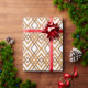Este papel de embrulho tem um design de deco de arte que sobrepõe diamantes em castanho e bronzeado em um campo de branco.
