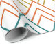 Este papel de embrulho tem um design de deco de arte invertido Vs em cores retrorativas de laranja, lacre, ouro, preto, vermelho, marrom e cinza.
