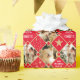 Enrole seu presente de Natal no estilo Art Deco com este presente de fotos personalizado! Um padrão geométrico sem costura, com formas de diamante, estrelas e tipografia de na moda. Personalize o modelo com três fotos favoritas, o nome do receptor e a idade de aniversário. Uma forma única e luxuosa de celebrar a época festiva para familiares e amigos! Cores impressas: vermelho, branco e ouro. Disponível com a opção de um acabamento mate ou brilhante.