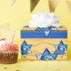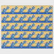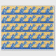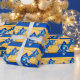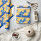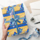 O belo papel brilhante de embrulho de presente apresenta a pintura digital original de Jewbilee de uma Estrela de Vidro Escorregada de Arte inspirada em diferentes tons de azul real flutuando sobre um fundo em três camadas de ondas amarelas profundas, prata na chave grega preta e faixas horizontais azuis reais.