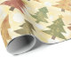 Papel festivo alegre de embalagem com um padrão de árvore de Natal. As cores são verduras macias e castanhos.