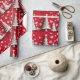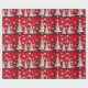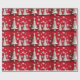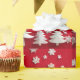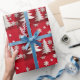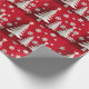 Papel de embrulho vermelho com árvores brancas e flocos de neve