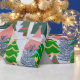 Este papel de embrulho tem uma design de árvores de Natal em vários tons de verde, rosa, prata e ouro com diferentes decorações.