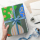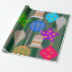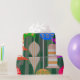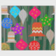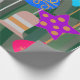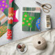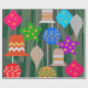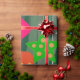 Este papel de embrulho tem um design que se parece com ornamentos em vermelho, verde, azul, rosa, ouro, prata e branco em uma árvore de Natal.