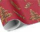 Este papel de envolvimento do feriado caracteriza um teste padrão com a palavra "Noel" no ouro e nas árvores de Natal feitos de símbolos dourados da flor de lis.
