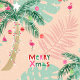 Embalagem de presente de Natal tropical com palmeiras decoradas e cartazes "Merry XMas". O brilho dourado usado nesse impressão é simulado, não é uma relíquia real. Arte original de Marketa Stengl.