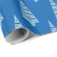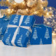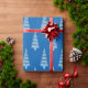 Papel de embrulho de presente de Natal mostrado com fundo azul e impressão de árvores de Natal festivas. Personalize este papel ou comprar como está.