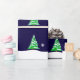 O papel de envolvimento do Natal com um teste padrão de árvores e de neve de Natal lasca-se em um fundo azul escuro.