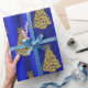 Um papel de embrulho de Natal azul, colorido e decorativo, com um padrão de árvores de Natal reluzentes e ouros sobre um fundo azul metálico, para acrescentar um toque sofisticado e elegante aos presentes de Natal nesta época de Natal. (Notas do designer: há também adesivos correspondentes, caixa de presente, saco de presente, etiqueta de presente, envelope, fita e papel de tecido com este design, basta clicar no link 'Disponível em outros Produtos' abaixo para verificá-los).