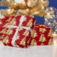 Ouros de Natal e árvores de Natal brancas sobre fundo cintilante vermelho