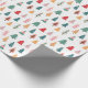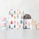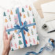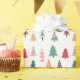 Papel de embrulho festivo de Natal, com um padrão de árvores coloridas.