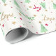 Papel de embrulho festivo de Natal, com um padrão colorido de folha verde, com árvores de Natal e estrelas, sobre fundo branco. Joy, Love e Peace em texto colorido, podem ser personalizados para ler o que você quer.