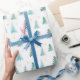 Papel branco de embrulho, adornado com um padrão repetitivo de árvores verdes-azuis minimalistas e estrelas delicadas. Essa elegante e subestimada design capta a essência da estação, fazer-a perfeita para comemorações tradicionais e contemporâneas.