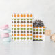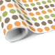 Papel de enrolamento com um padrão geométrico cativante de grandes bolinhas em tons picantes de laranja, castanho e verde. Esta design é uma celebração da paleta vibrante do outono, perfeita para adicionar um toque de charme sazonal aos seus presentes.