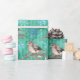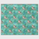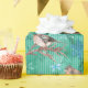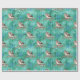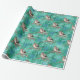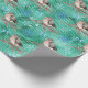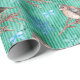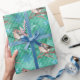 Um belo papel de embrulho tem pássaros doces sentados em galhos de árvores com flocos de neve caindo ao seu redor. O fundo é verde com um padrão listrado de luz.