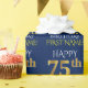 Este design de papel de embrulho apresenta uma mensagem como "FELIZ 75º ANIVERSÁRIO", com o "75º" a ter uma aparência falsa/imitação de ouro. Ele também apresenta um nome que pode ser personalizado e um fundo de cor azul. Talvez possa ser utilizado quando se dá presentes para o setenta e cinco anos de alguém. [~Z0000135]