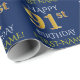 Este design de papel de embrulho apresenta uma mensagem como "FELIZ 91rua ANIVERSÁRIO", com a "91ruas" com aparência falsa/imitação de ouro. Ele também apresenta um nome personalizado e um fundo de cor azul. Talvez possa ser utilizado quando se dá presentes para o nonagésimo primeiro aniversário de alguém. [~Z0000135]