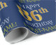 Este design de papel de embrulho apresenta uma mensagem como "FELIZ 86º ANIVERSÁRIO", com o "86º" com aparência falsa/imitação de ouro. Ele também apresenta um nome personalizável e um fundo de cor azul. Talvez possa ser utilizada quando se dá presentes para o oitenta e sexto aniversário de alguém. [~Z0000135]