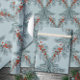 Um papel elegante, sofisticado e festivo de embalagem, que inclui ramos de espadilha azuis e bagas vermelhas, na formação de alcatifas, sobre fundo azul empoeirado.