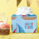 "Ahoy Ali" Cita a mensagem do tesouro do barco a aquarela náutica Pirate em um papel de enrolamento azul de garrafa.