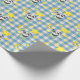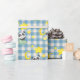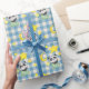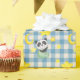Panda de bebê bonita com lua amarela brilhante e estrelas num padrão de gingham azul.