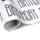 Texto de aniversário contemporâneo em branco com balões de festa e confete colorido. A cor de fundo pode ser alterada.