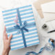 Papel De Presente Bandas Horizontais Pequenas e Azuis Bebês e Branca