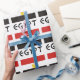 Papel de embrulho para presente apresenta a bandeira egípcia com três faixas horizontais de vermelho, branco e preto. Uma águia dourada está no centro. Este design apresenta a bandeira com a palavra EGITO por baixo em letras pretas. Papel de embrulho para presente para compartilhar sua herança em qualquer ocasião.