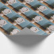 Uma sanita branca é posicionada contra uma parede com papel de parede azul e padronizado com ouro, com chão ladrilhado de cor castanho-bronca, complementando o estilo retrô da decoração do banheiro