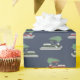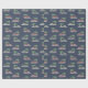 Este papel de embrulho é perfeito para o Natal. O presente contém ilustrações de botas de pontoon com uma árvore de Natal no topo contra um fundo azul marinho.