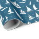 Barcos-vela brancos em papel de enrolamento náutico azul profundo. Folha azul-presente de marinho divertido impressa com barcos à vela brancos e iates. Belo plástico náutico para presentes.