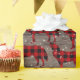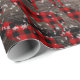 Um papel de embrulho de Natal com um fundo de conselho de celeiro de madeira com um lobo de xadrez de búfalo com padrões repetidos.