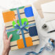 Este papel de embrulho tem um design Bauhaus de várias cores. Divertido e ousado.