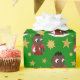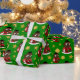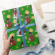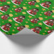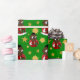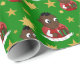 Papel de embrulho de Natal com ilustração de uma menina ou rapaz preto feliz sorridente e feliz, o bebê está a vestir roupas vermelhas e brancas e a segurar um presente; com modelo de texto editável para o seu nome ou mensagem, design de feriados de Natal com um fundo verde sem falhas com estrelas