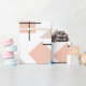 Este papel de embrulho tem um design de Bauhaus de retângulos, quadrados, diamantes e triângulos repetidos em cores de praia de bronzeado, cinza, azul e laranja.