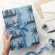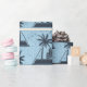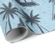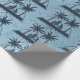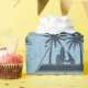 Design geométrico do tema moderno das praias com silhuetas de palmeiras, pranchas de surfe e patinetes sobre fundo azul angustiado