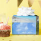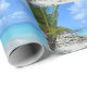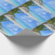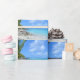 Wrapping paper with a scenic tropical photograph. A secluded beach with white sand and turquoise water.