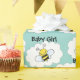 Abelhas negras e amarelas sorridentes zunindo-se sobre nuvens brancas lisas e um fundo ciano pastel leve com uma ou duas linhas de texto personalizadas para uma menina ou um menino e personalizadas com um nome ou data para comemorar um chá de fraldas ou aniversário fofo.