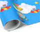 Bonito. Bonito. Bonito. Fundo dos azul-céu. Nuvem poofy grande e uma estrela de sorriso. Um urso de ursinho que voam um avião do vermelho e do ouro e um bebê em uma cobertura sustentaram meus balões dados forma três corações