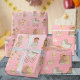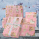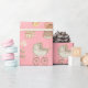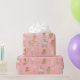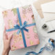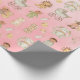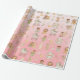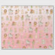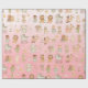 Papel de embalagem para bebês que inclui bebês internacionais pintados a aquarelas, com animais, carrinhos, garrafas, patos de borracha, blocos e animais recheados a cor-de-rosa.