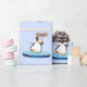 Uma ilustração da época de inverno de desenho animado, com um pinguim desajeitado, parado em um chão de gelo, segurando um cartaz de madeira exibido "x-mas" em um fundo azul.