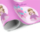 Uma festa de aniversário de princesa rosa adorável, que embrulha papel com um castelo de gelo bonito. Possui uma garota bonito em um vestido de bola e tiara. Personalize este presente com o nome do seu filho.