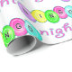 Esta design tem bolas de bingo que soletram BINGO e a palavra noite num fundo branco. Há outra versão com bingo à noite que tem fundo preto e uma faixa de arco-íris neon.