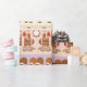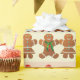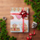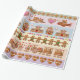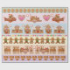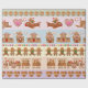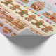 Este papel de embrulho festivo em matizes otimistas e pálidos com várias casas de pão de gengibre, uma fila de árvores de Natal, um de pão de gengibre, um de biscoitos de gengibre dançante, um barco a vapor, um casal de trens a vapor e aviões, faz a adição perfeita aos presentes de Natal.