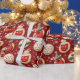 Papel de embrulho festivo com um padrão de Cookies de Natal em fundo vermelho.