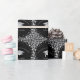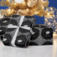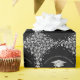 This modern design features a graduation hat and confetti in silver on a background of black with white text.