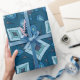 Este papel de empacotamento apresenta um na moda e um design dinâmico. O padrão é uma mistura de formas quadradas e de diamante em tons de azul e azul-esverdeados, acentuados por linhas de tinta pretas sujas que acrescentam um toque artístico e fluido ao olhar geométrico.
