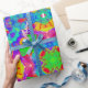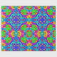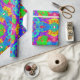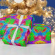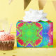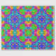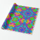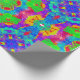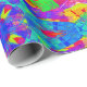 Este papel de embrulho apresenta um design abstrato brilhante e energético. O padrão é uma mistura de formas circulares vibrantes e blocos retangulares pintados de cor em tons de verde brilhante, roxo, rosa quente, amarelo e vermelho, criando um aspecto dinâmico e festivo.