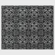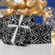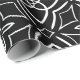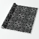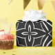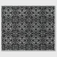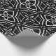 Este papel de embrulho apresenta um design ousado e expressivo. O padrão é um gráfico de forma floral pontiaguda de quatro pétalas, criado com fortes braçadeiras brancas que se destacam dramaticamente contra o fundo preto. O olhar geral é moderno e artístico.