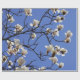 Design apresenta uma bela imagem de flores brancas de magnólia em floração contra um fundo azul-céu.
